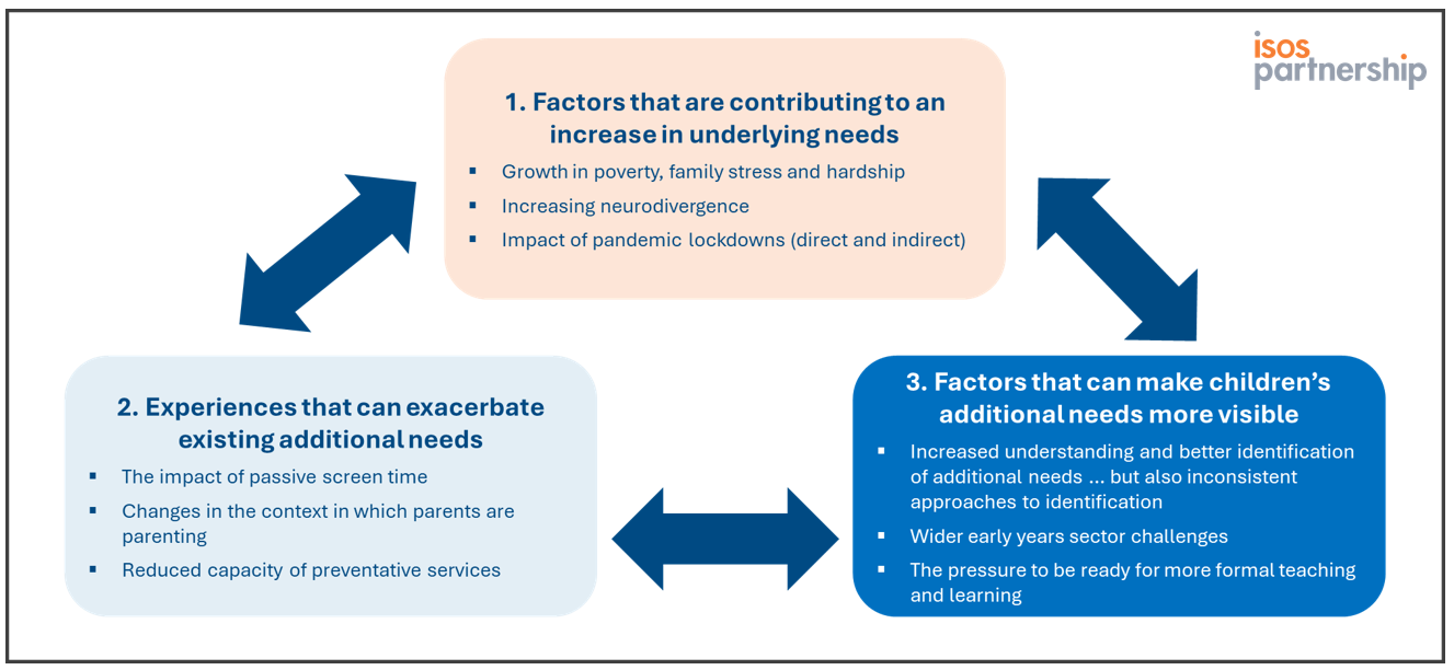 Overall, our research suggested that “rising needs in the early years” does not solely reflect a rise in SEND, but instead that the rise in the identification of SEND in the early years is itself a reflection of a much broader and more complex set of trends leading to more children requiring additional support in their early years.