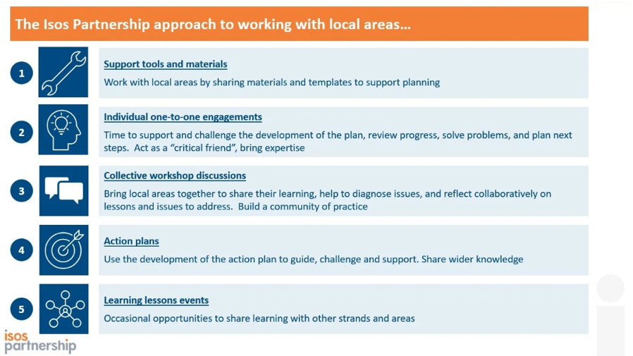 Isos Partnership collaborated closely with each local area’s education partnership to design, implement and reflect on pilot activities. Our approach combined research, facilitation, peer learning and ongoing structured engagement - our Isos Partnership approach.